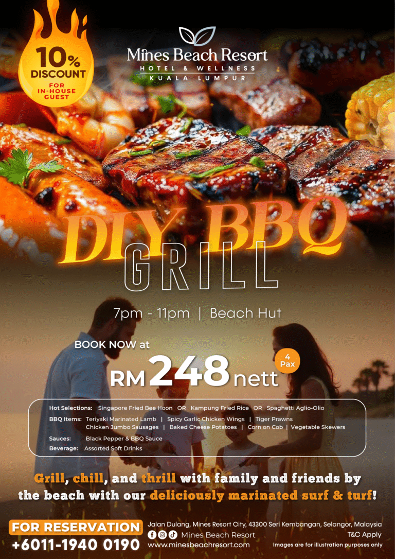 Savor the ultimate DIY BBQ experience at Mines Beach Resort! Enjoy delicious marinated meats, fresh seafood and vibrant beach vibes with family and friends.